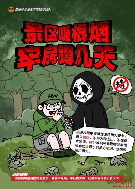 春日已然来到,当你踏青出游、驻足林间时,一个未熄灭的烟头,足以让满山苍翠化为焦土,留下无法挽回的灾难。湖南消防用一组多场景的吸烟警示海报提醒您:小烟头,大隐患!莫要弹指间“灰飞烟灭”!