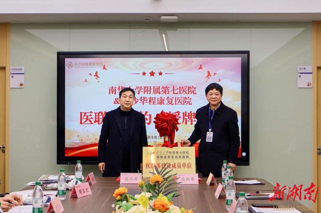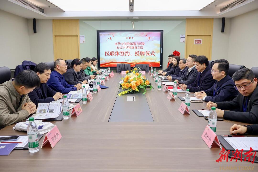 新湖南客户端3月17日讯(通讯员 颜妤珊)3月16日下午,南华大学附属第七医院(湖南省荣军优抚医院)与长沙华程康复医院医联体签约仪式在长沙华程康复医院圆满举行。此次签约标志着两家医院正式建立深度医疗合作关系,开启了资源共享、优势互补、携手共进的康复医疗发展新篇章。南华大学附属第七医院党委委员、副院长曾健,党委委员、总会计师刘赟,党委委员、副院长王正根带领院办公室、医务部、护理部、康复科等13个核心科室负责人出席仪式,长沙华程康复医院执行院长孙绍裘,副院长张洪范、彭建国及各科室负责人热情接待并参与本次活动。