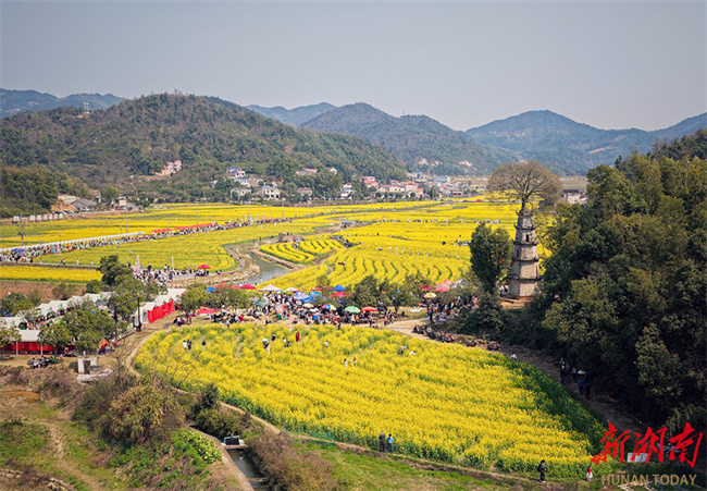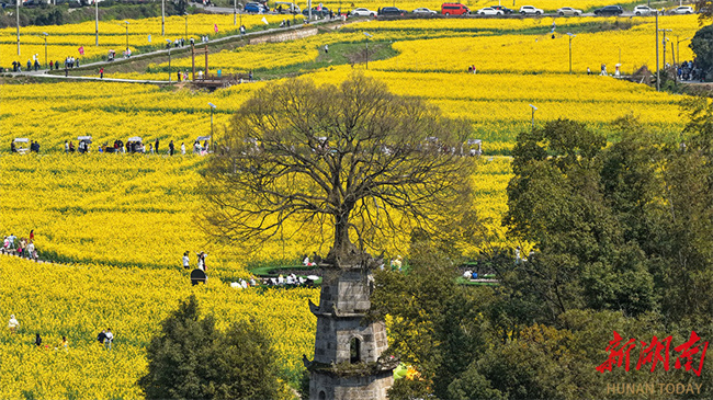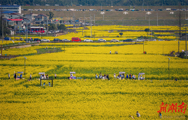 On March 14, the 10,000 mu (667 ha.) of canola flower fields in Chating Town, Wangcheng District, Changsha, entered their peak blooming period, attracting numerous visitors to enjoy the blossoms on a spring outing. In recent years, the town authority has created expansive floral landscapes through large-scale cultivation and organized accompanying events such as fun runs and concerts, to promote the integrated development of agriculture and tourism. (Photo/Tong Di, Hunan Daily)