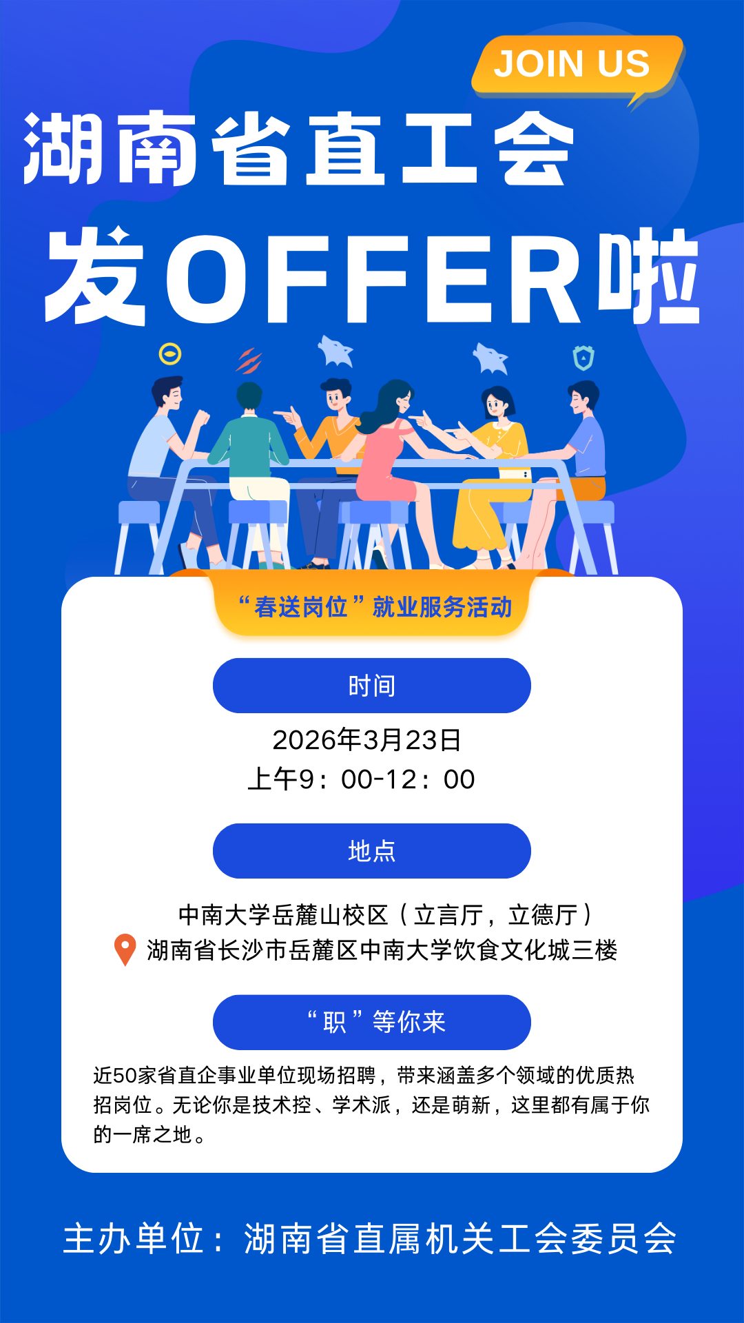新湖南客户端3月17日讯(记者 陈小薇)为落实全国总工会“559”工作部署,进一步发挥工会组织在促进就业创业中的重要作用,推动工会就业服务工作提质增效,湖南省直工会充分发挥工会组织桥梁纽带作用和“娘家人”服务职能,聚焦高校毕业生、转岗待岗职工、困难职工家庭成员等重要群体,精准对接需求,优化服务举措,打造一个工会主导、省直联动、校企协同的高水平就业对接平台。通过沉浸式体验、精准化服务、全周期赋能,推动实现更充分、更高质量就业,为湖南高质量发展注入青春活力与人才动能。
