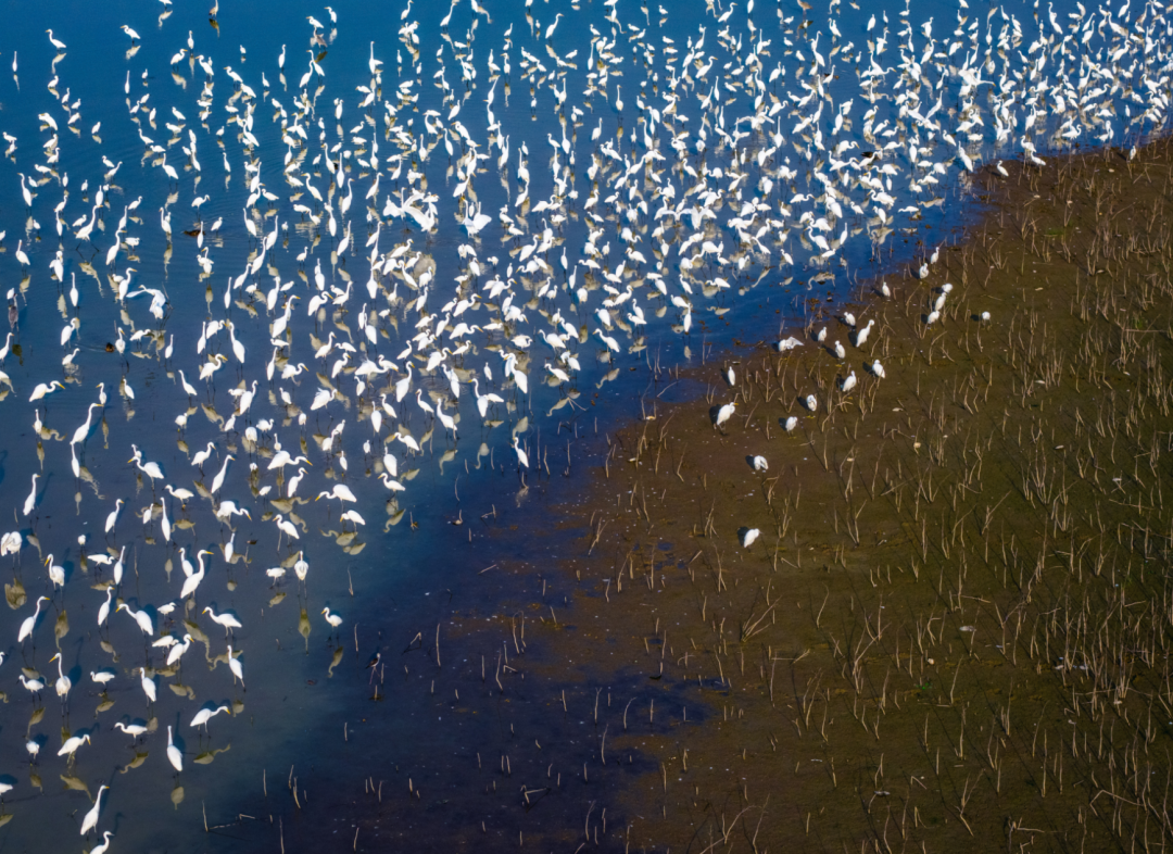 成群的白鹭在浅滩上聚集又散开,如潮汐般规律。