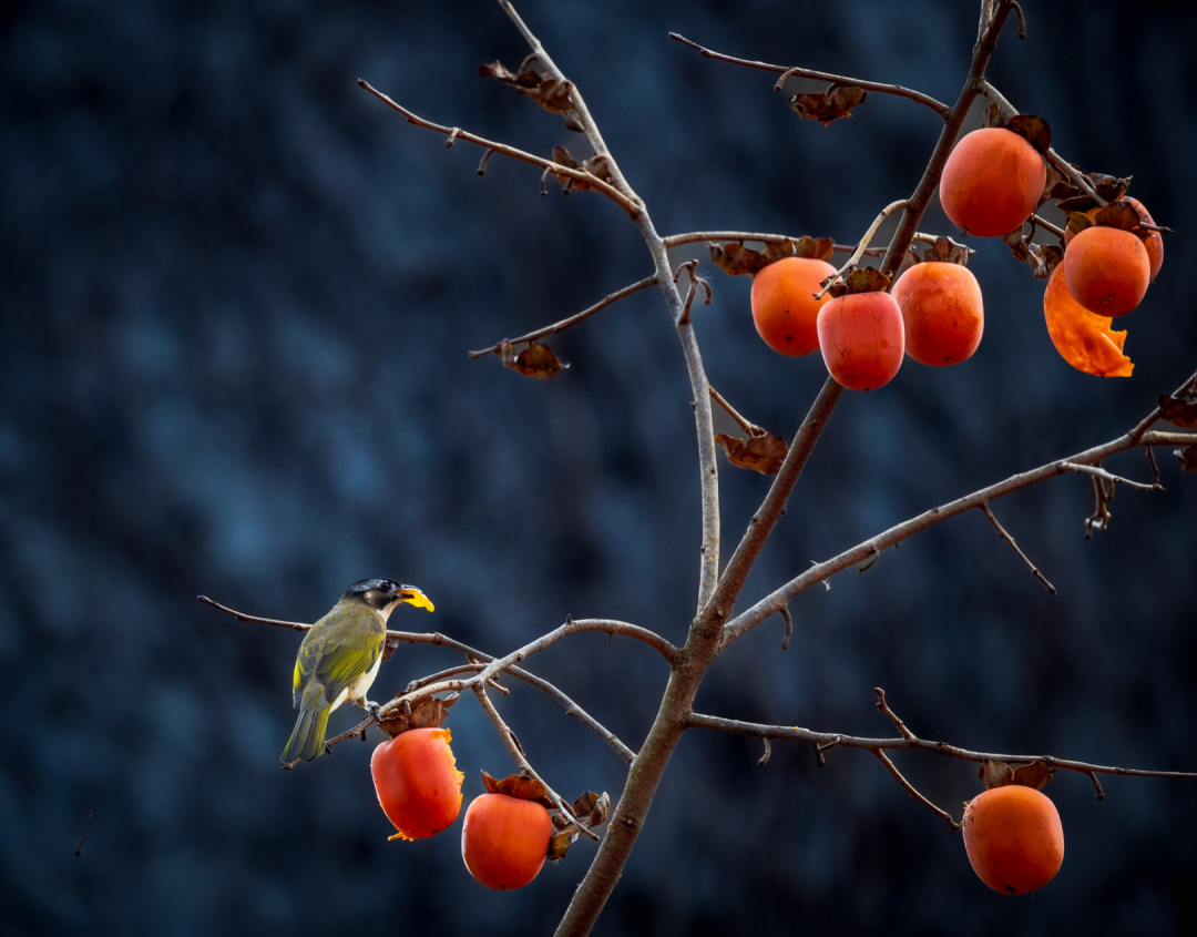鸟儿停在挂满果实的枝头,羽与果一同点亮了季节。
