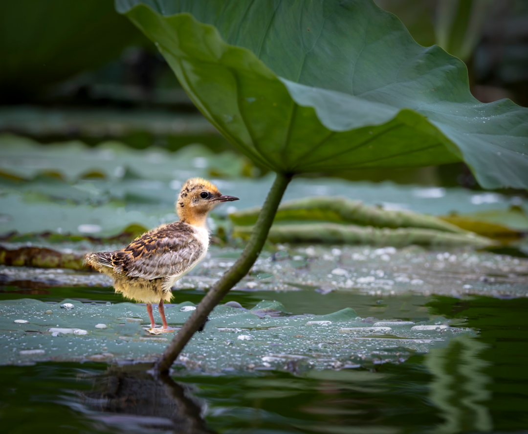 一只幼鸟站在荷叶边缘,小心翼翼地探索。