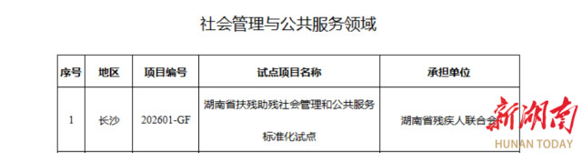 湖南日报·新湖南客户端3月17日讯(记者 马如兰 通讯员 黄伊婷)近日,湖南省市场监督管理局印发《关于下达2026年度省级标准化试点项目的通知》,由湖南省残疾人联合会承担的《湖南省扶残助残社会管理和公共服务标准化试点》获批立项。