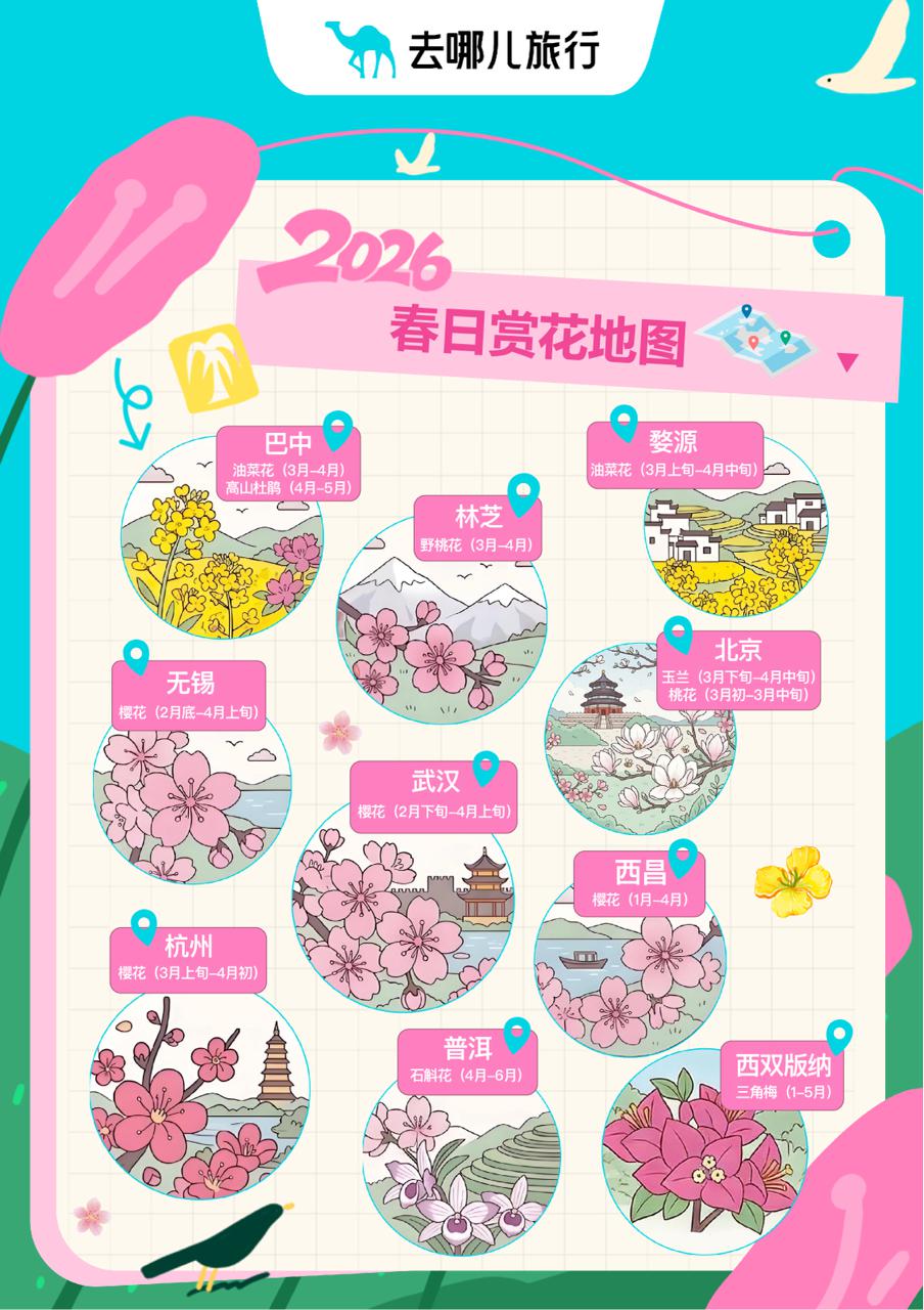 提及赏花,武汉、杭州、云南仍是顶流。大批“追花全勤生”不仅打飞的跨城追花,也选择在花海附近住下,深度感受春意。去哪儿旅行数据显示,截至目前,在3月最热门的飞行目的地与酒店入住城市中,杭州、成都、武汉、昆明、大理等传统追花热门城市都进入TOP15。