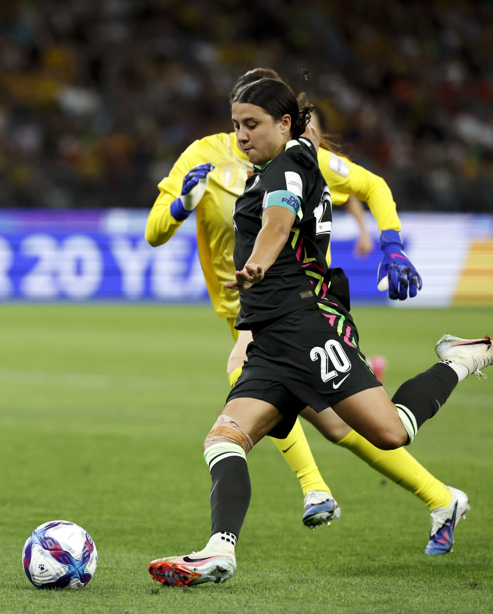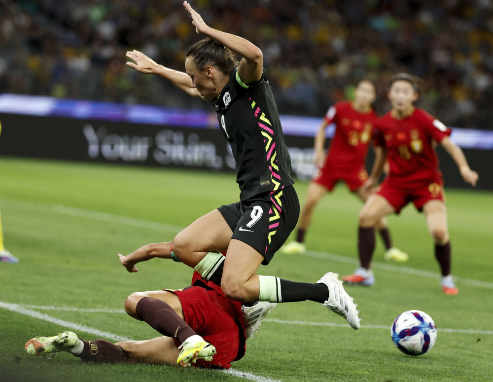 ↑ 中国队球员张琳艳(上左)在禁区内被澳大利亚队守门员麦肯齐·阿诺德绊倒。随后,阿诺德被判黄牌,张琳艳获得点球机会。新华社记者 马平 摄