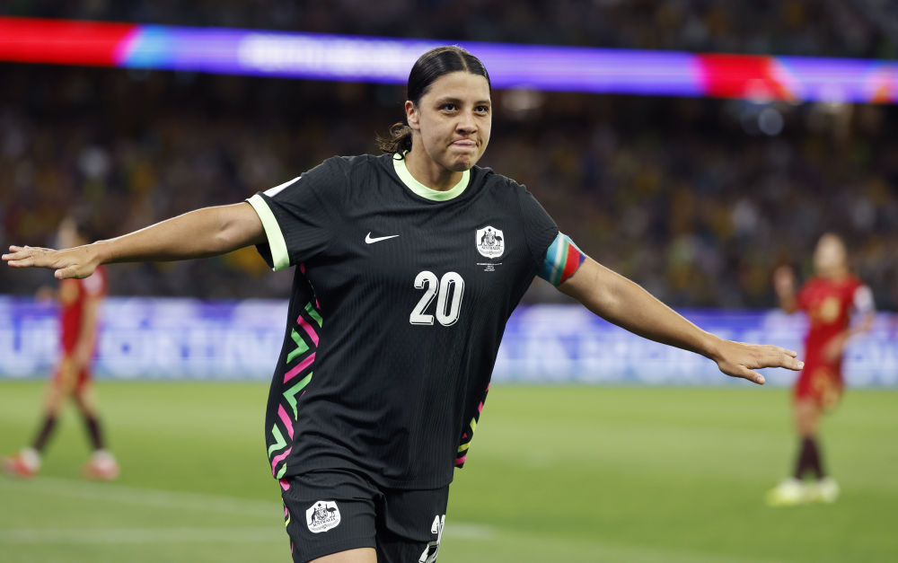 ↑ 澳大利亚队球员克尔庆祝进球。新华社记者 马平 摄