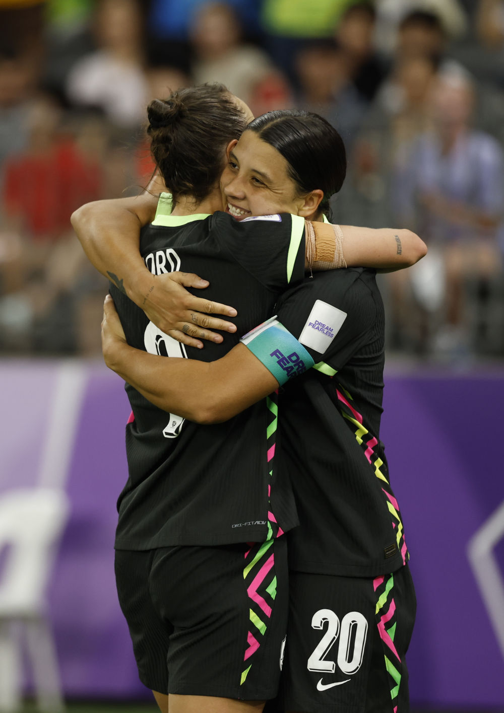 ↑ 澳大利亚队球员克尔(右)进球后与队友庆祝。新华社记者 马平 摄