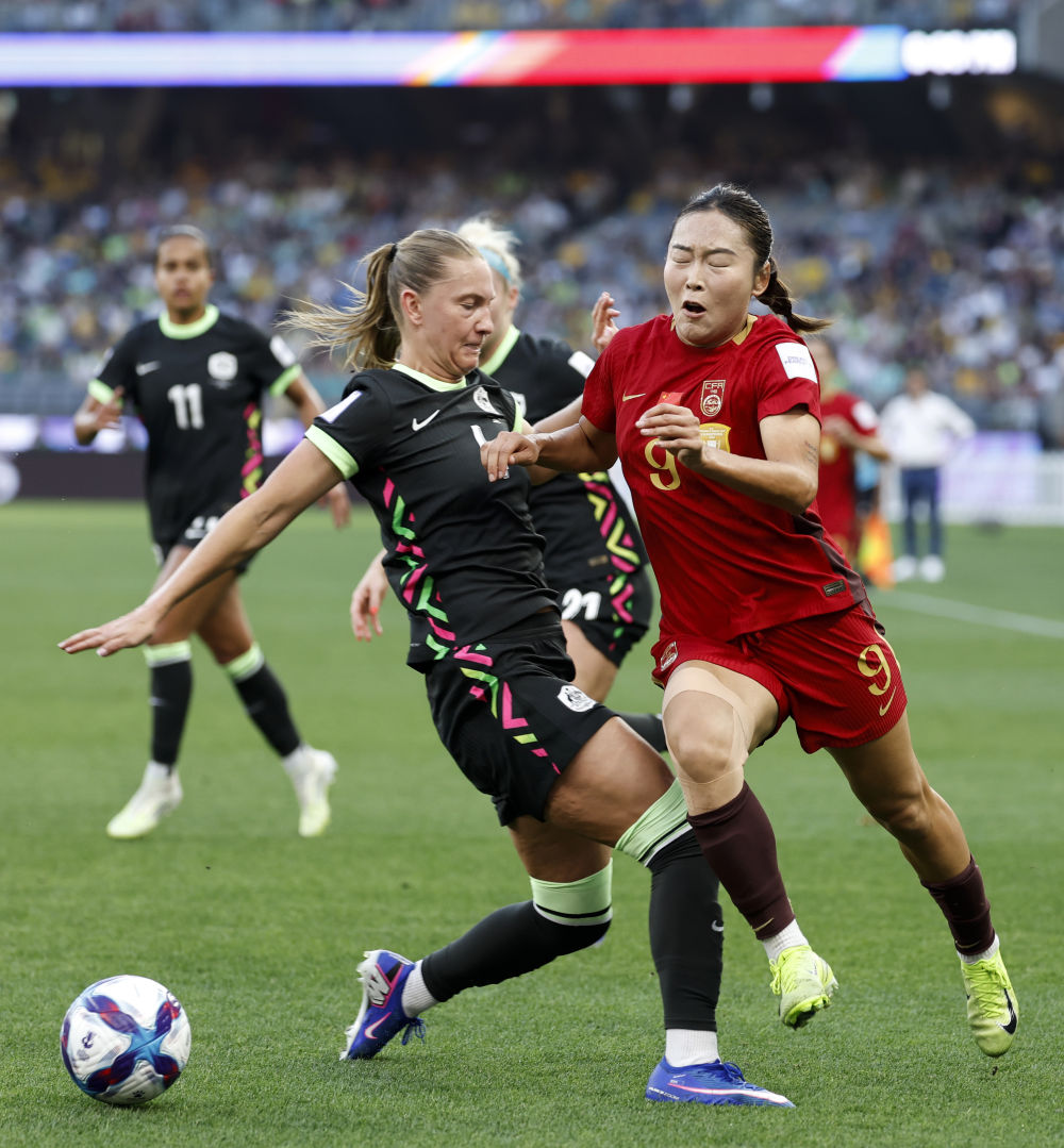 ↑ 澳大利亚队球员富德(右)与中国队球员张程雪拼抢。新华社记者 马平 摄