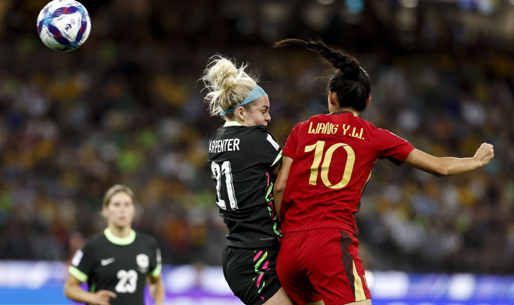 ↑ 澳大利亚队球员卡彭特(中)与中国队球员王妍雯(右)争顶。新华社记者 马平 摄