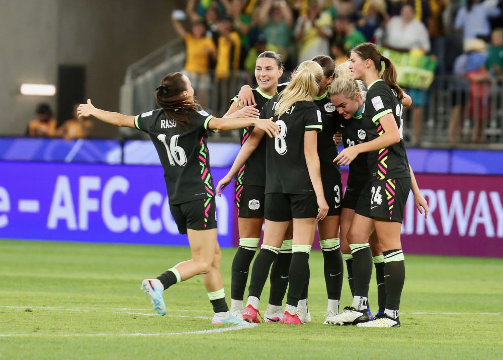 ↑ 澳大利亚队球员庆祝进球。新华社发(周丹摄)