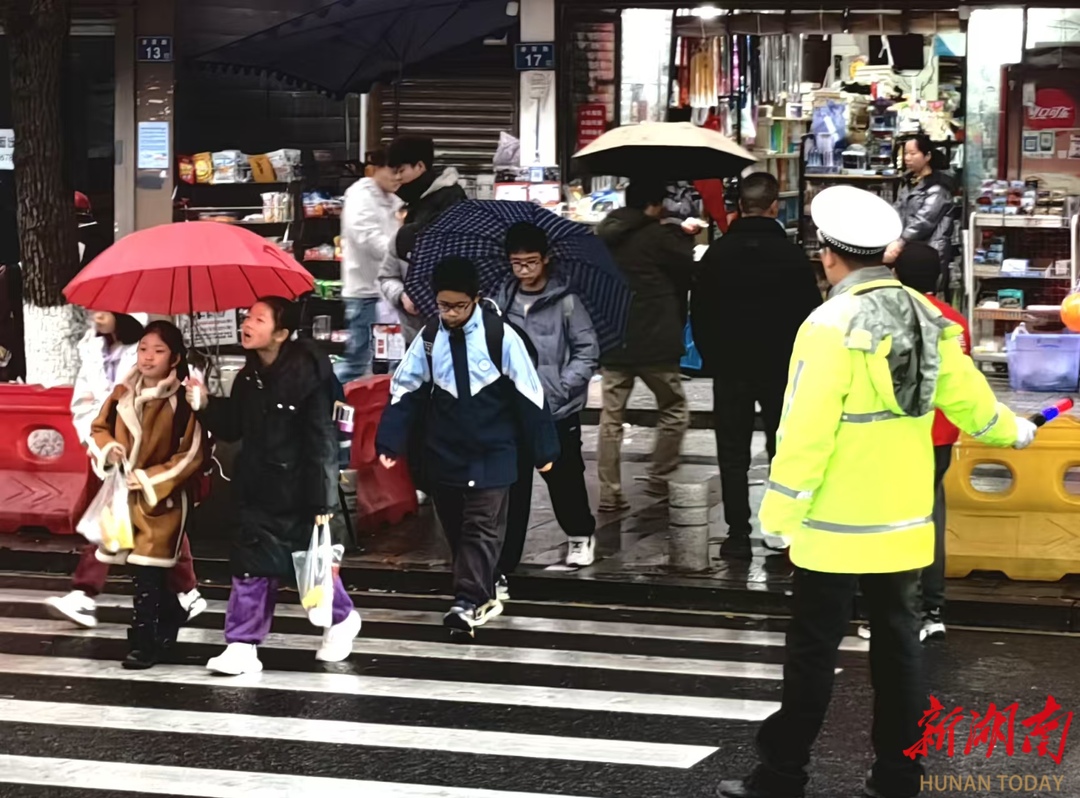 3月17日清晨7时30分,长沙市芙蓉区大同崇文小学门前,执勤交警正冒雨疏导交通。近年来,长沙市公安局将校园安全保障作为长期重点工作持续推进。胡立强 摄(湖南图片库)