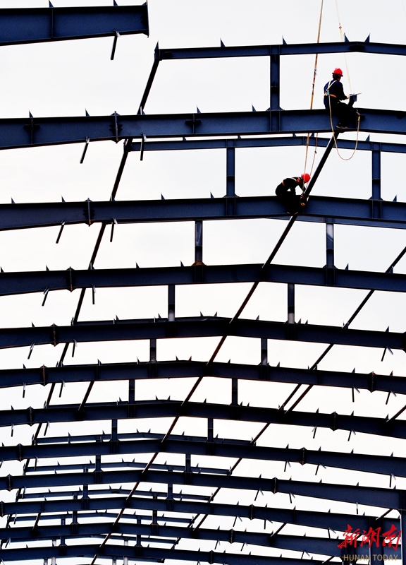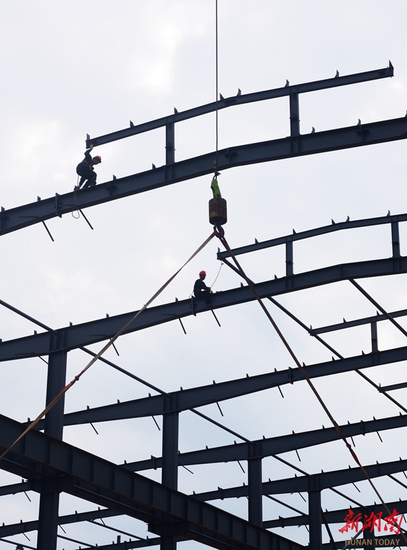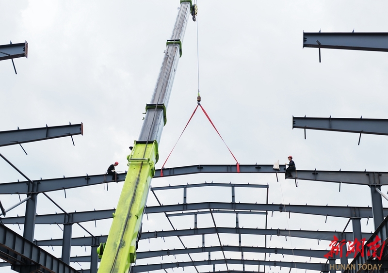 3月17日,嘉禾高新区湖南群机智能装备有限公司标准厂房建设工地,工人正在进行吊装作业。该项目占地141亩,规划建设8万平方米厂房。近年来,嘉禾县持续优化营商环境,扎实推进项目建设,带动产业提质增效,促进工业经济高质量发展。黄春涛 摄(湖南图片库)