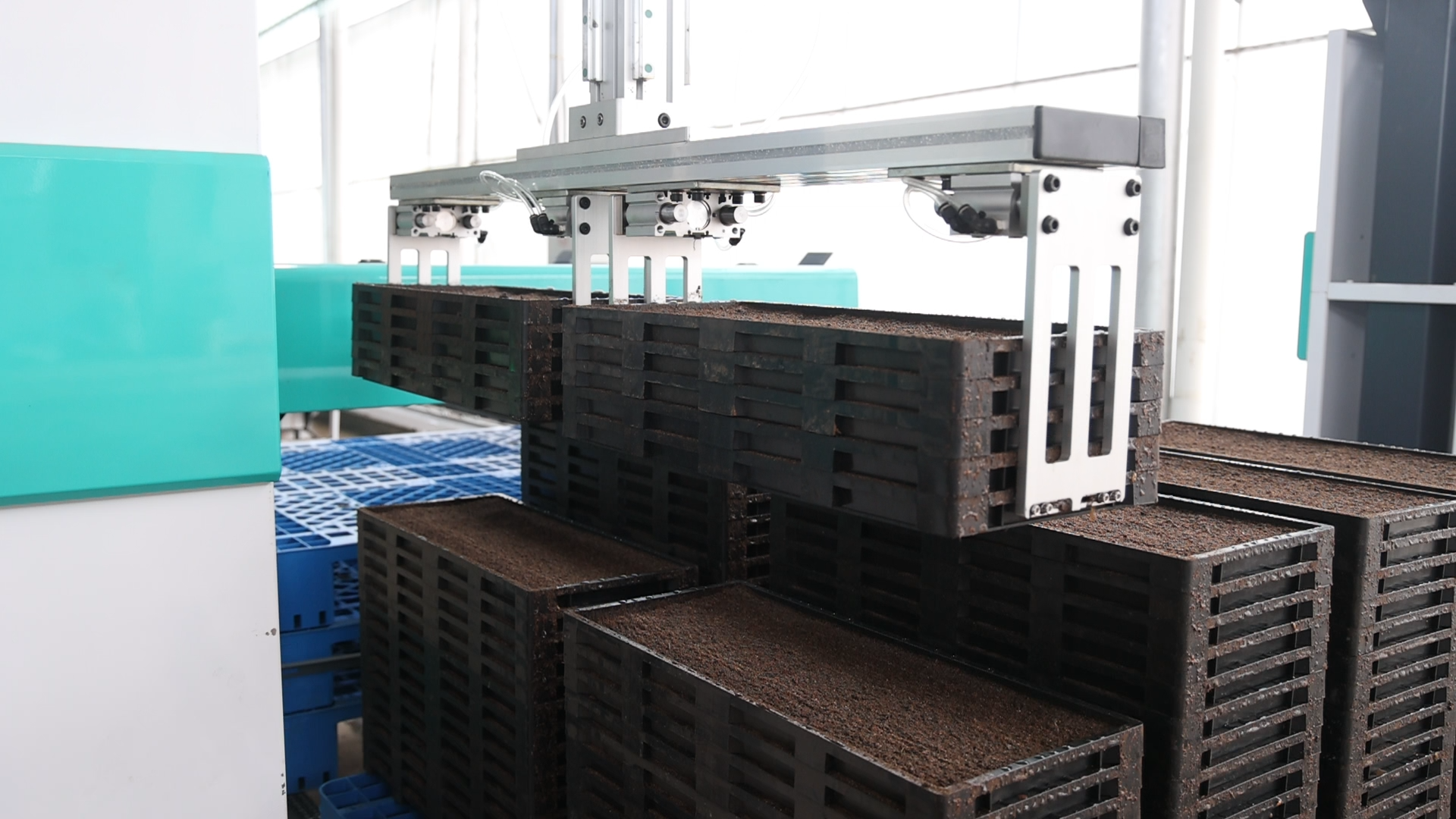在生产现场,工人们将营养土和经过预处理的稻种倒入进料口,流水线随即启动全流程自动化作业:均匀铺土、洒水浸透、精准定量播种、覆盖细土,一系列工序一气呵成。随着传送带运转,成型的育秧盘整齐输出,自动有序码放至转运架,全程无需人工过多干预。“以前8个人围着老设备转,一小时育800盘,还得反复检查播种均匀度。现在4个人操作新机器,每小时最多能出2000盘。”基地负责人介绍,育秧效率和质量均有大幅提升。