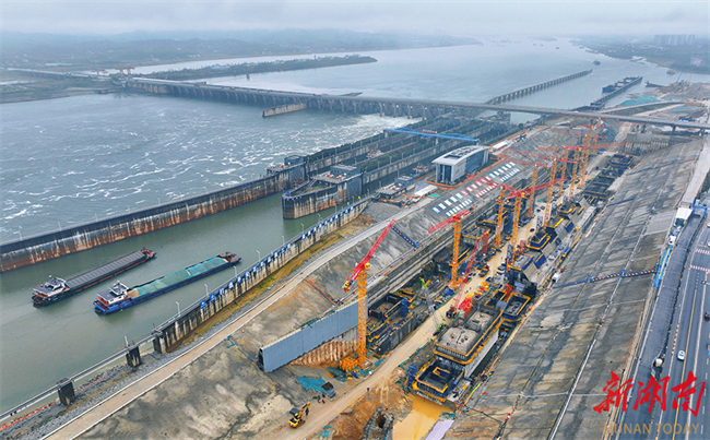 The photo, taken on March 16, shows the construction of the Changsha Comprehensive Hub Third-line Ship Lock on the Xiangjiang River progressing smoothly. The project is Hunan's first Class I waterway that can accommodate 3,000-tonne vessels. More than half of the construction work has been completed, while the main structure construction is advancing in full swing and is anticipated to be capped in late September. Upon completion, vessels of up to 3,000 tonnes will be able to access Wuhan and Shanghai directly via the project throughout the year, which will greatly enhance the shipping capacity of the Xiangjiang River. (Photo/Xu Xing, Hunan Daily)