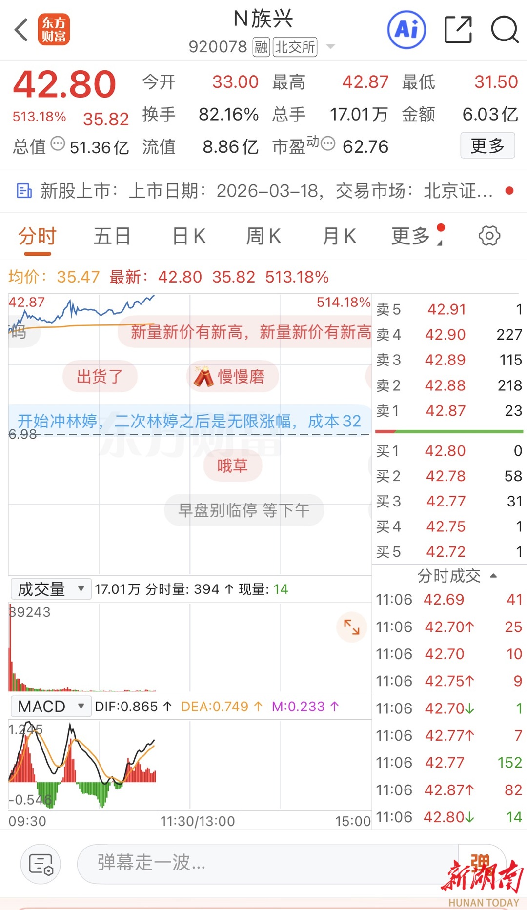 公司的股票简称为族兴新材,股票代码“920078”,发行价格为6.98元/股,开盘价为33元,涨幅372.78%。截至记者发稿,股价为42.8元/股 ,涨幅513%。