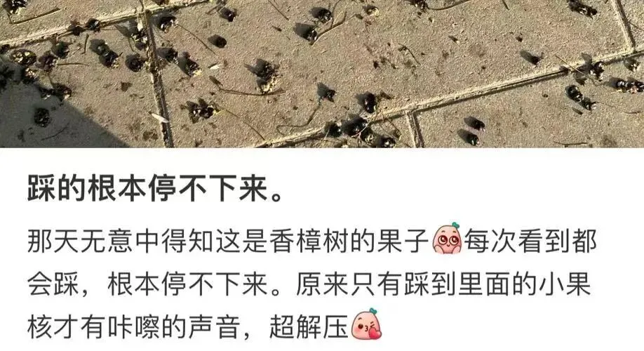 香樟树果实是浆果,果实成熟后果肉中含有花色苷和少量的油脂及芳香类物质,其种仁含40%多的油脂,腐烂或压碎后会使物体表面着色,会给人们生活中造成一些烦恼。