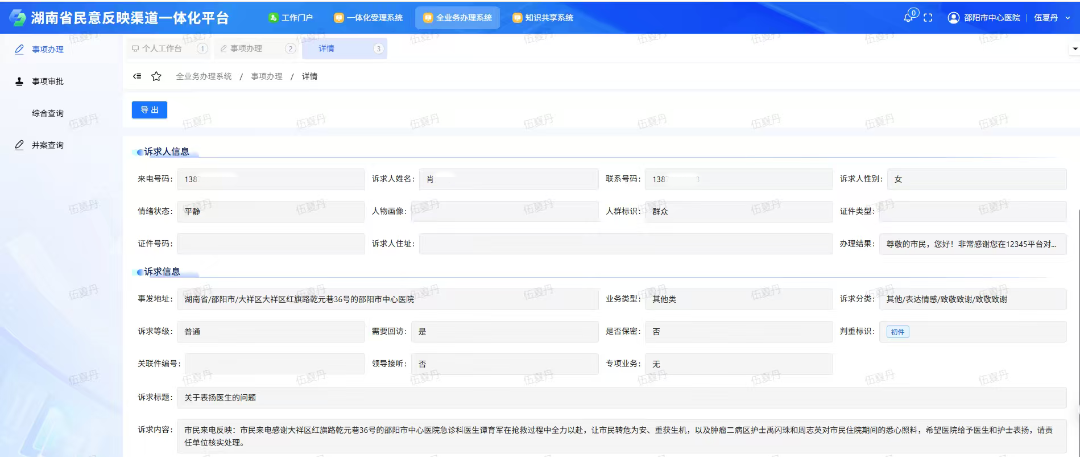 大众卫生报·新湖南客户端3月18日讯(通讯员 雷贝婷 阳媚)“医生护士全力以赴,让我转危为安、重获生机……”近日,邵阳市中心医院收到一份来自12345市民热线的表扬单。市民肖阿姨来电点名表扬该院ICU医生谭玉军在抢救过程中的全力以赴,同时感谢肿瘤二病区护士禹闪珠、周志英对其住院期间的悉心照料。这份来自市民热线的肯定,字字情真意切,体现了患者及家属在我院就医过程中的感动与敬意。