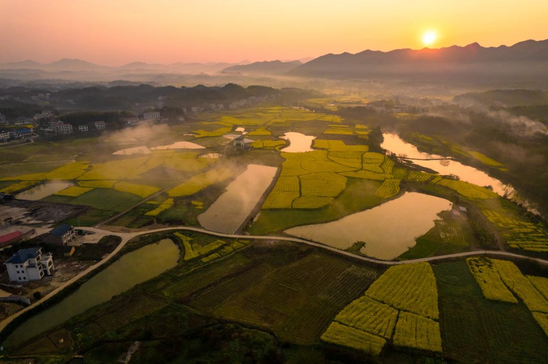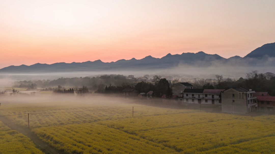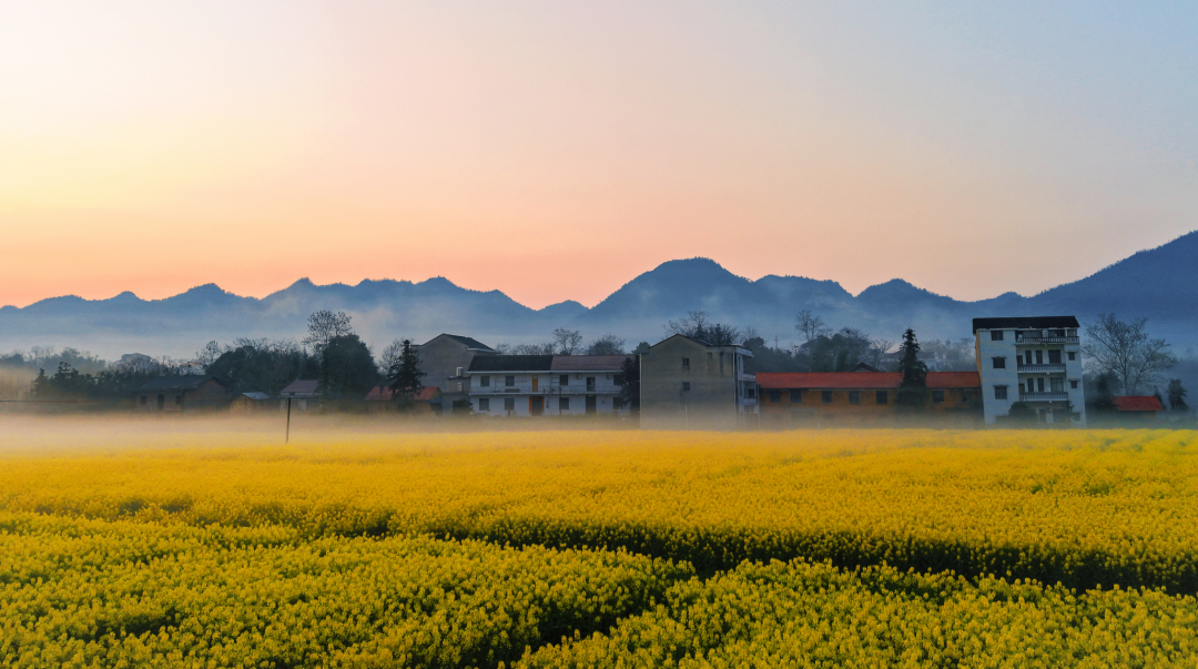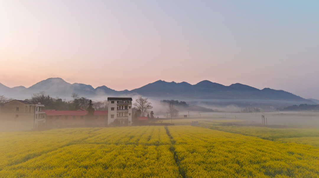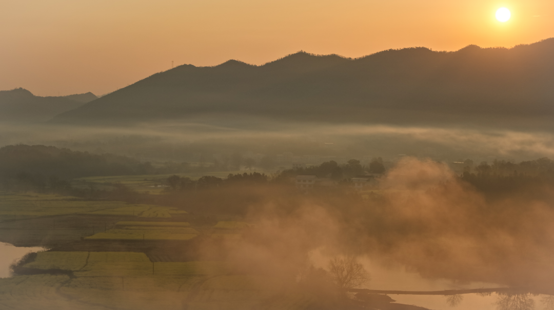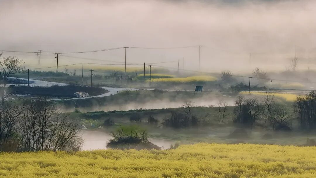 清晨,河面上总浮着一层薄雾,轻轻柔柔,如纱似绢。雾气自水面升起,慢慢散开,随风飘动。时而,它像一匹素练横卧河上,将岸边的油菜花田、田野与村落温柔隔开;时而,雾气向上升腾,令远山近树皆朦朦胧胧,晕染成一幅静谧的水墨长卷。雾色之中,弯弯的河道与若隐若现的屋舍显得格外宁静。