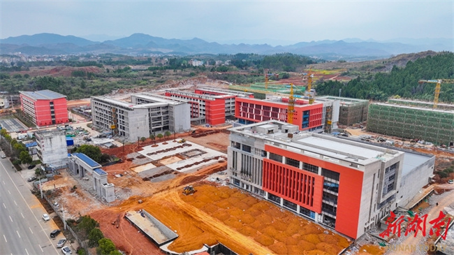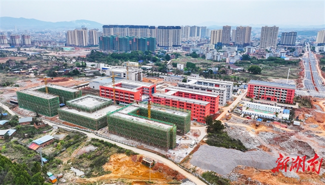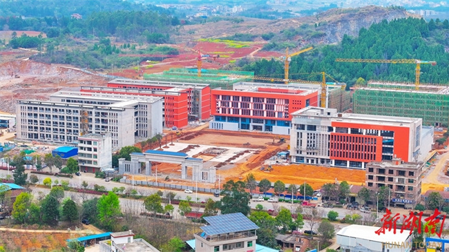 The photo, taken on March 17, shows multiple teaching buildings at the construction site of the Industry-Education Integration Project for Vocational Education and Training in Xintian County. The project is planned to provide 6,000 school places in 120 classes, including supporting facilities such as teaching buildings, a library, and student dormitories. Currently, the main construction work has been completed, and the project has entered the exterior wall finishing phase which is expected to be completed by the end of July.