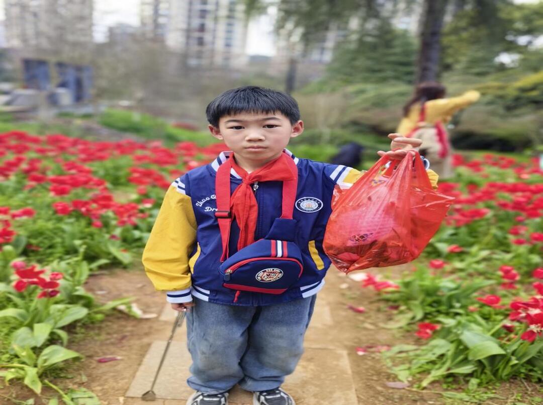 科普研学环节结束后,各班迅速进入“战斗”状态。在樱花树下、在水杉景观带旁,随处可见孩子们弯腰捡拾的身影和耐心劝导的身姿。家长们作为志愿者全程护航,不仅保障了孩子们的安全,更以身作则参与到志愿服务中,生动诠释了家校共育的强大力量。