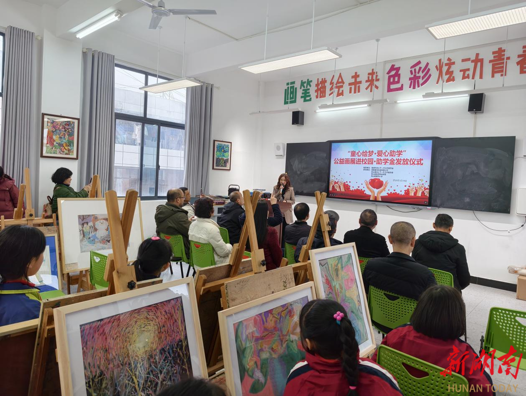 本次活动以“公益画展进校园·助学金发放仪式”为主线,集中展出来自西班牙、湘潭和龙山三地的儿童优秀绘画作品集中展出,孩子们用稚嫩的画笔描绘出心中的梦想与美好,展现新时代少年儿童的艺术风采和纯真情感。