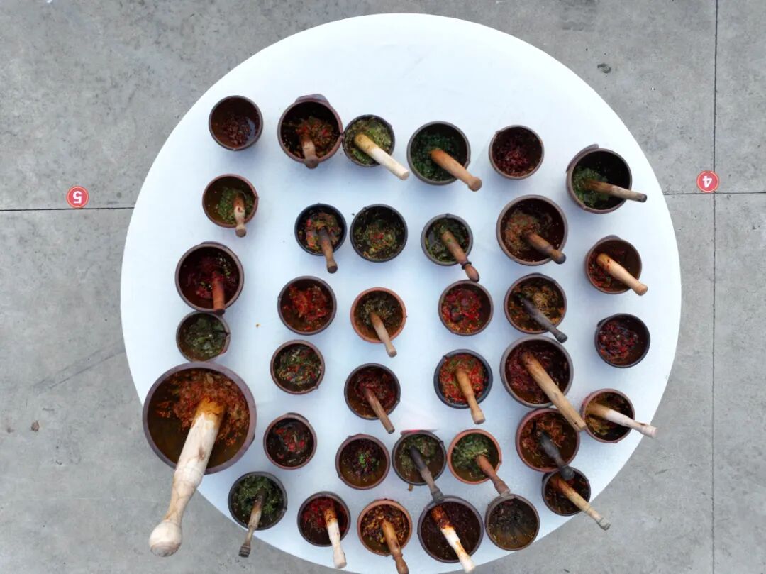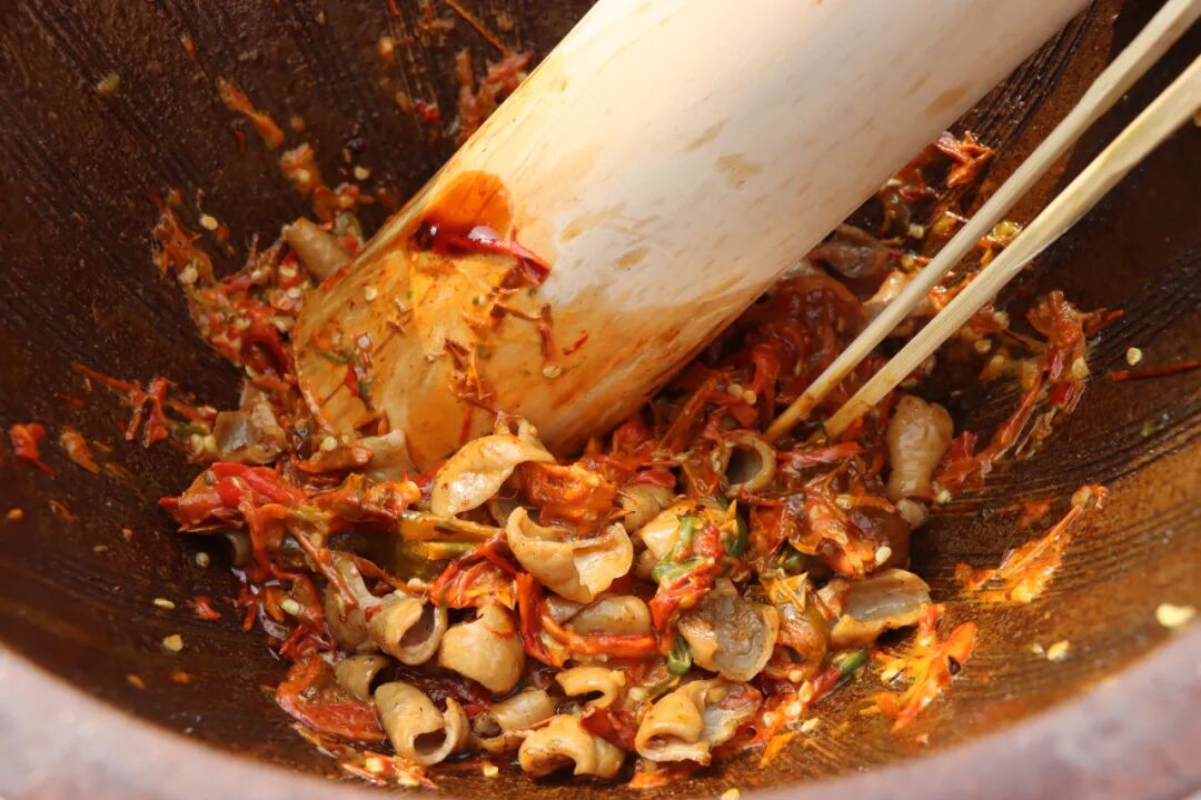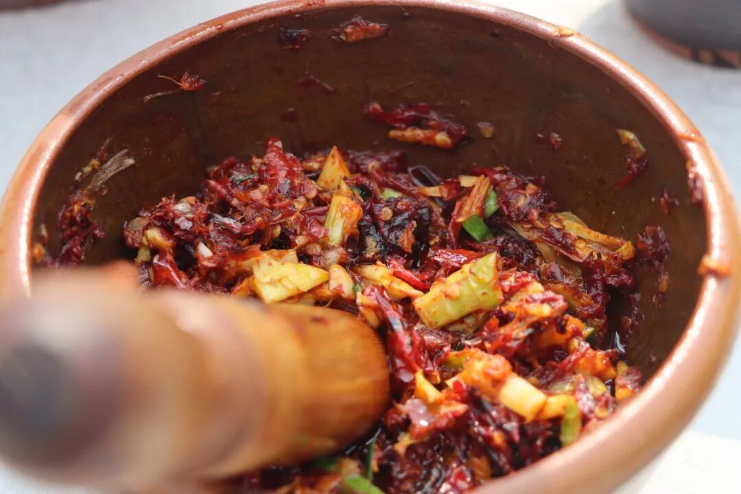 焦钵在手,抖棍起落。辣椒、蒜末、豆油与各式配菜充分交融,一股浓郁而治愈的复合香气弥漫全场。光是闻着,便让人食欲大开——无论是配米饭还是拌面条,都是安仁人餐桌上的灵魂美味。