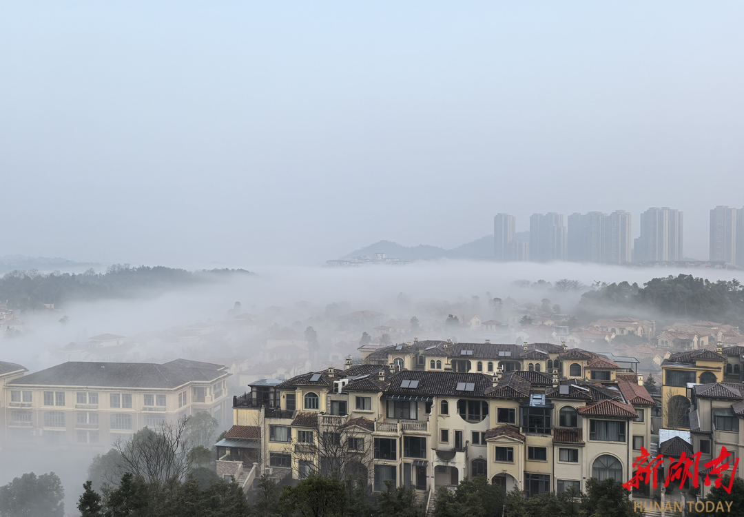 3月11日清晨,长沙市望城区现罕见平流雾景观。氤氲晨雾中,中粮北纬28度小区建筑群若隐若现,宛如人间仙境,尽显朦胧诗意。李军 摄(湖南图片库)