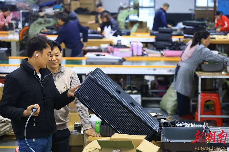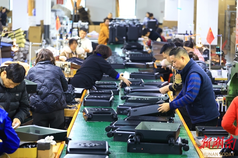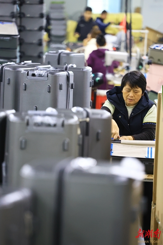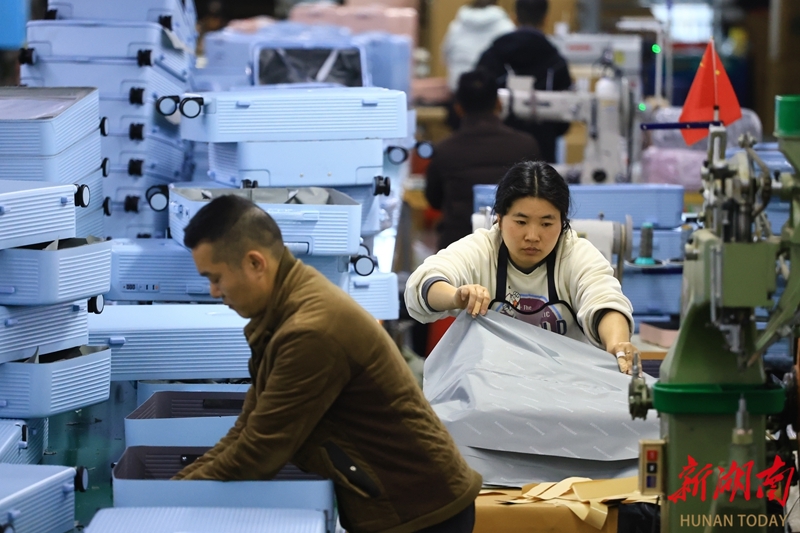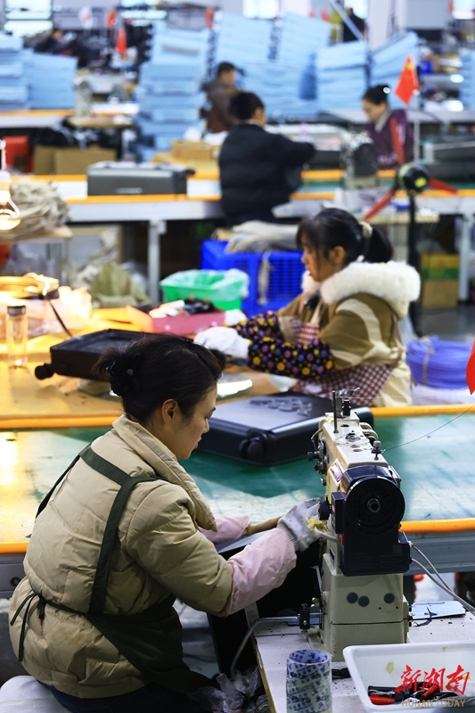 3月18日,怀化国际陆港经开区湖南凌秀箱包制造有限责任公司生产车间,工人在加紧赶制订单产品。该公司依托陆港物流优势,产品远销欧美、中东等地区。目前通过生产线升级改造,公司正全力冲刺日产5000只箱包的生产目标。柴均林 彭雪杨 摄影报道(湖南图片库)