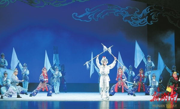 “我们这次用简单、平白、干净的线条来完成舞美。”该剧舞美设计张滴洋介绍,本次演出的舞美设计紧扣剧种气质与湖湘性格,视觉上沿用白、青双色基调,整体追求极简大气、意境悠远的东方美学,营造出写意而富有想象力的视觉空间。