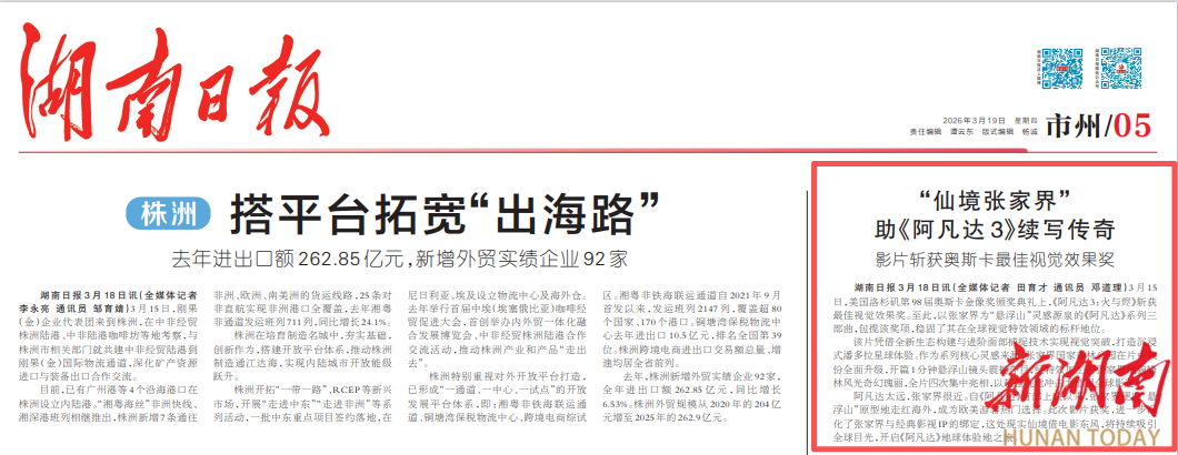 湖南日报3月18日讯(全媒体记者 田育才 通讯员 邓道理)3月15日,美国洛杉矶第98届奥斯卡金像奖颁奖典礼上,《阿凡达3:火与烬》斩获最佳视觉效果奖。至此,以张家界为“悬浮山”灵感源泉的《阿凡达》系列三部曲,包揽该奖项,稳固了其在全球视觉特效领域的标杆地位。