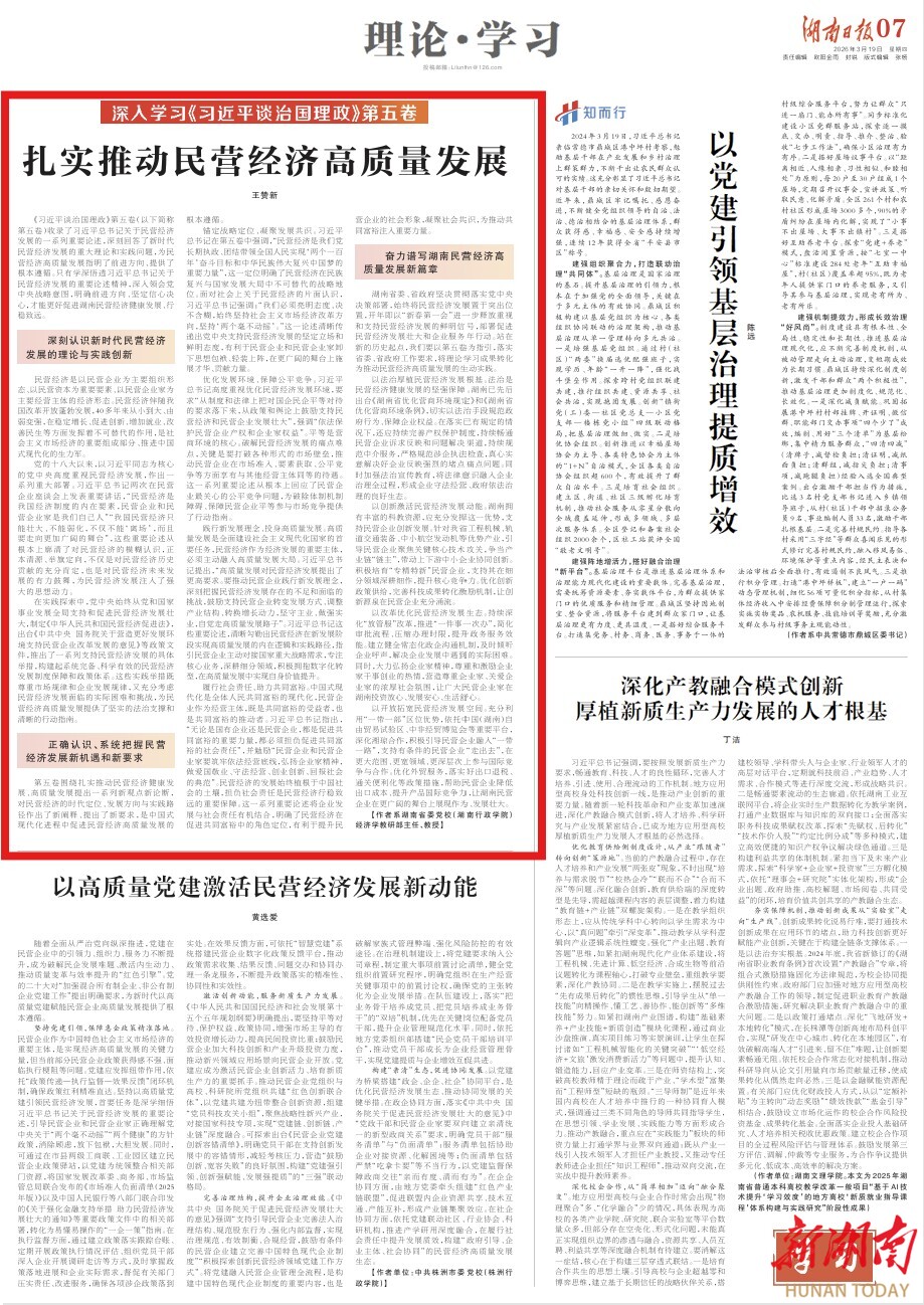 湖南省委、省政府坚决贯彻落实党中央决策部署,始终将民营经济发展置于突出位置,开年即以“新春第一会”进一步释放重视和支持民营经济发展的鲜明信号,部署促进民营经济发展壮大和企业服务年行动。站在新的历史起点,我们要以第五卷为指引,落实省委、省政府工作要求,将理论学习成果转化为推动民营经济高质量发展的生动实践。