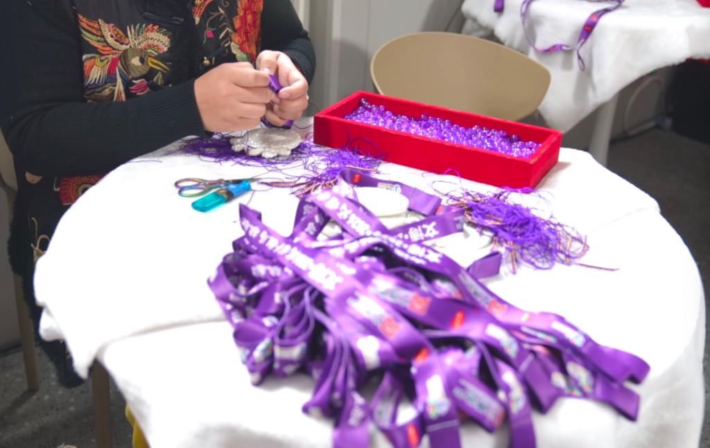 3月13日,绳编艺人在进行奖牌绶带装配。新华社记者 董笑坤 摄