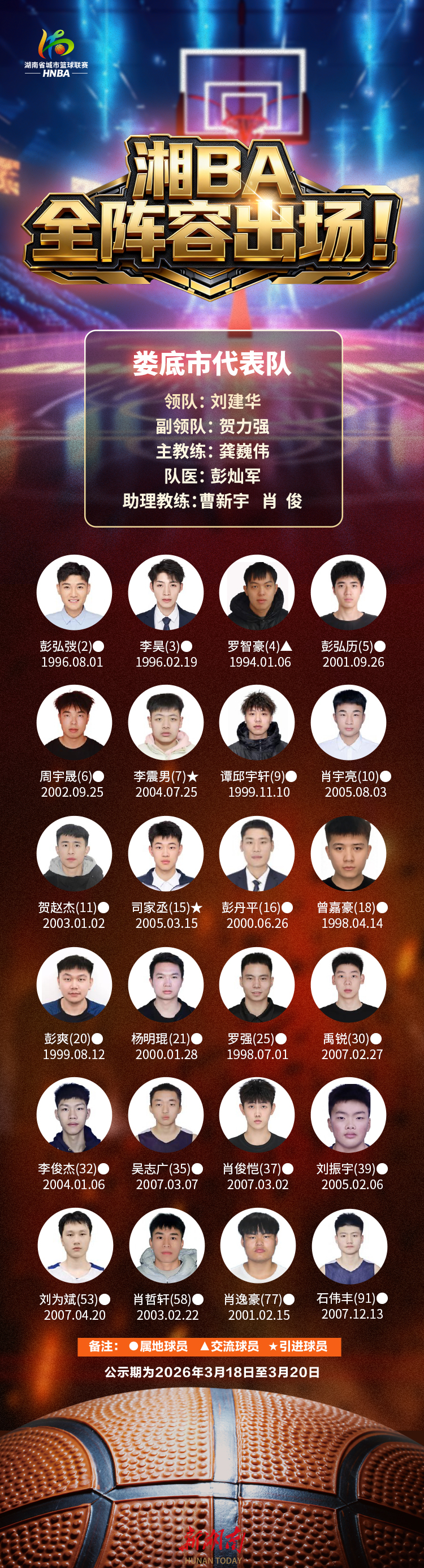 湖南日报·新湖南客户端3月19日讯(记者 蔡矜宜)2026湖南省城市篮球联赛(简称“湘BA”)即将于3月27日揭幕,各市州王牌已就位!3月18日晚,湖南省篮球协会发布通知,对联赛参赛运动员名单进行公示,公示期为2026年3月18日至3月20日。快来看看你家乡的王牌阵容有哪些本土球星吧!