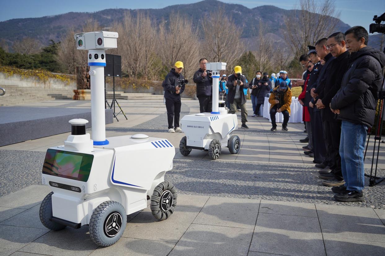 (3月19日,国家植物园(北园),智能机器人演示“巡逻”场景。)