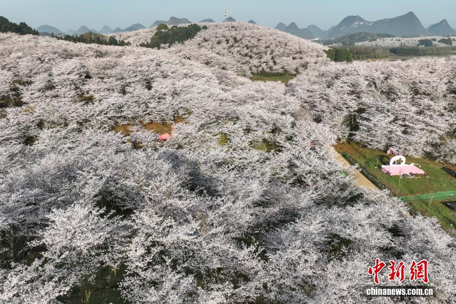 航拍贵州贵安新区万亩樱花园。近日,万亩樱花园内的樱花竞相绽放,美不胜收,吸引游客和市民前去观赏、拍照。(无人机照片)中新社记者 瞿宏伦 摄