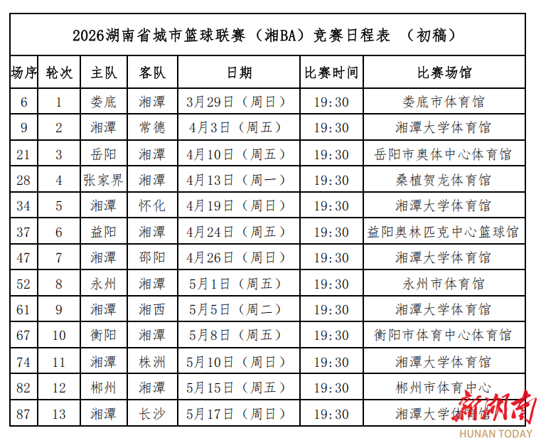 湖南日报·新湖南客户端3月19日讯(记者 蒋诗雨)“湘BA”3月27日即将开战!记者今日获悉,湘潭队竞赛日程表也已经出炉,包含6个主场、7个客场,共13轮比赛,3月29日将首战娄底队,湘潭队参赛运动员名单也正在公示中。一起来看看!