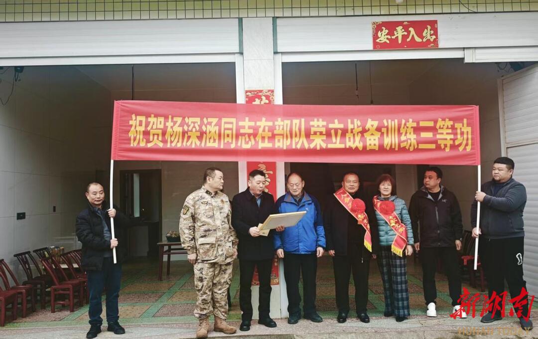 新湖南客户端3月19日讯(通讯员 丁慧敏)锣鼓声声催奋进,喜报连连暖人心。3月19日,浏阳市退役军人事务局副局长雷健、浏阳市澄潭江镇党委委员、武装部长、副镇长罗晓晖带队组成慰问组,拉着喜庆横幅、捧着烫金喜报、带着真挚祝福,敲锣打鼓来到现役军人杨深涵家中,为他荣立战备训练三等功送上最热烈的祝贺。