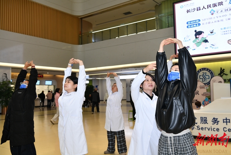 On March 17, residents experienced baduanjin (a traditional Chinese fitness exercise) under the guidance of medical staff in the outpatient lobby of Changsha County People's Hospital (Hunan Provincial People's Hospital Xingsha Campus). (Photo/Tian Chao, Hunan Daily)