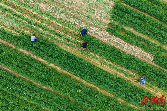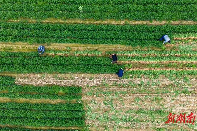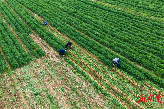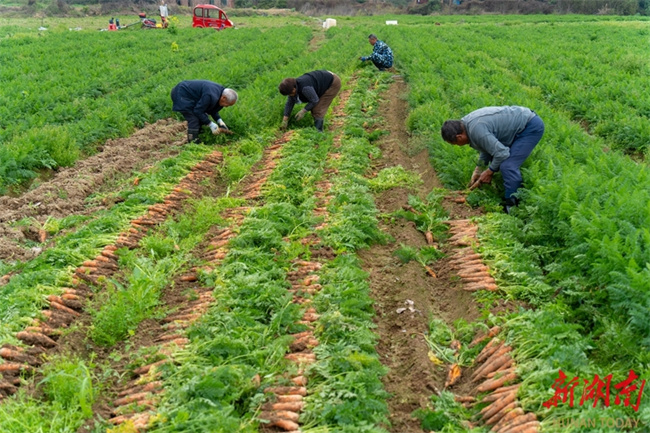 On March 17, villagers harvested carrots in Sanmiao Community, Lanjiaoshan Neighborhood, Lengshuitan District, Yongzhou City. In recent years, the local authority has vigorously promoted large-scale and standardized planting of specialty crops such as corn, sweet potatoes, carrots, and allium chinense, effectively increasing land productivity and boosting agricultural efficiency and farmers' income. (Photo/Lei Zhongxiang)