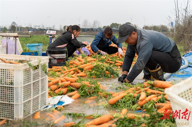 On March 17, villagers washed newly harvested carrots in Sanmiao Community, Lanjiaoshan Neighborhood, Lengshuitan District, Yongzhou City. In recent years, the local authority has vigorously promoted large-scale and standardized planting of specialty crops such as corn, sweet potatoes, carrots, and allium chinense, effectively increasing land productivity and boosting agricultural efficiency and farmers' income. (Photo/Lei Zhongxiang)