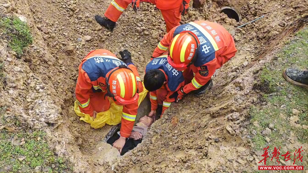 穿戴好防护装备后,消防救援人员从破开的涵洞口缓慢靠近老人,对其开展伤情检查,确认老人无骨折、意识清醒后,随即对头部进行保护措施,与外部人员配合将老人缓慢移出涵洞。经过40多分钟的紧张处置,老人被成功解救,并现场移交120送医救治。