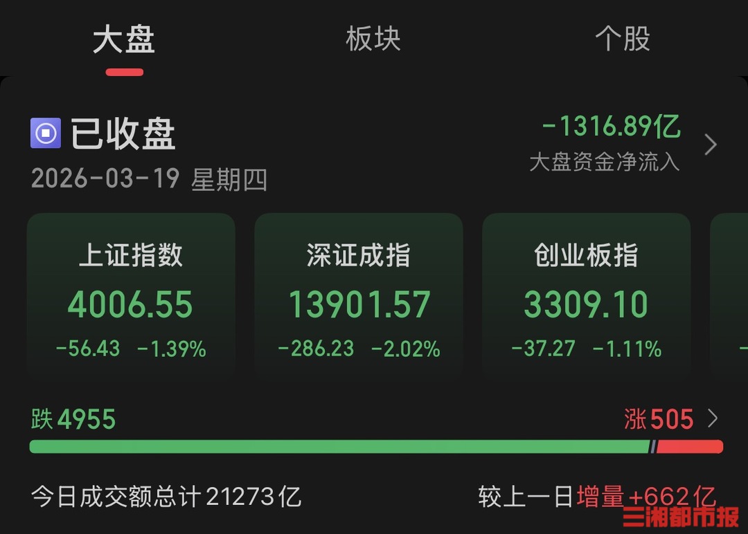 三湘都市报·新湖南客户端3月19日讯(全媒体记者 仝若楠)3月19日,A股全天震荡回调,三大指数集体收跌且跌幅均超1%。沪指盘中一度跌破4000点关口,刷新今年1月以来新低。截至收盘,沪指下跌1.39%,深成指下跌2.02%,创业板指下跌1.11%。市场有约5000只个股下跌。