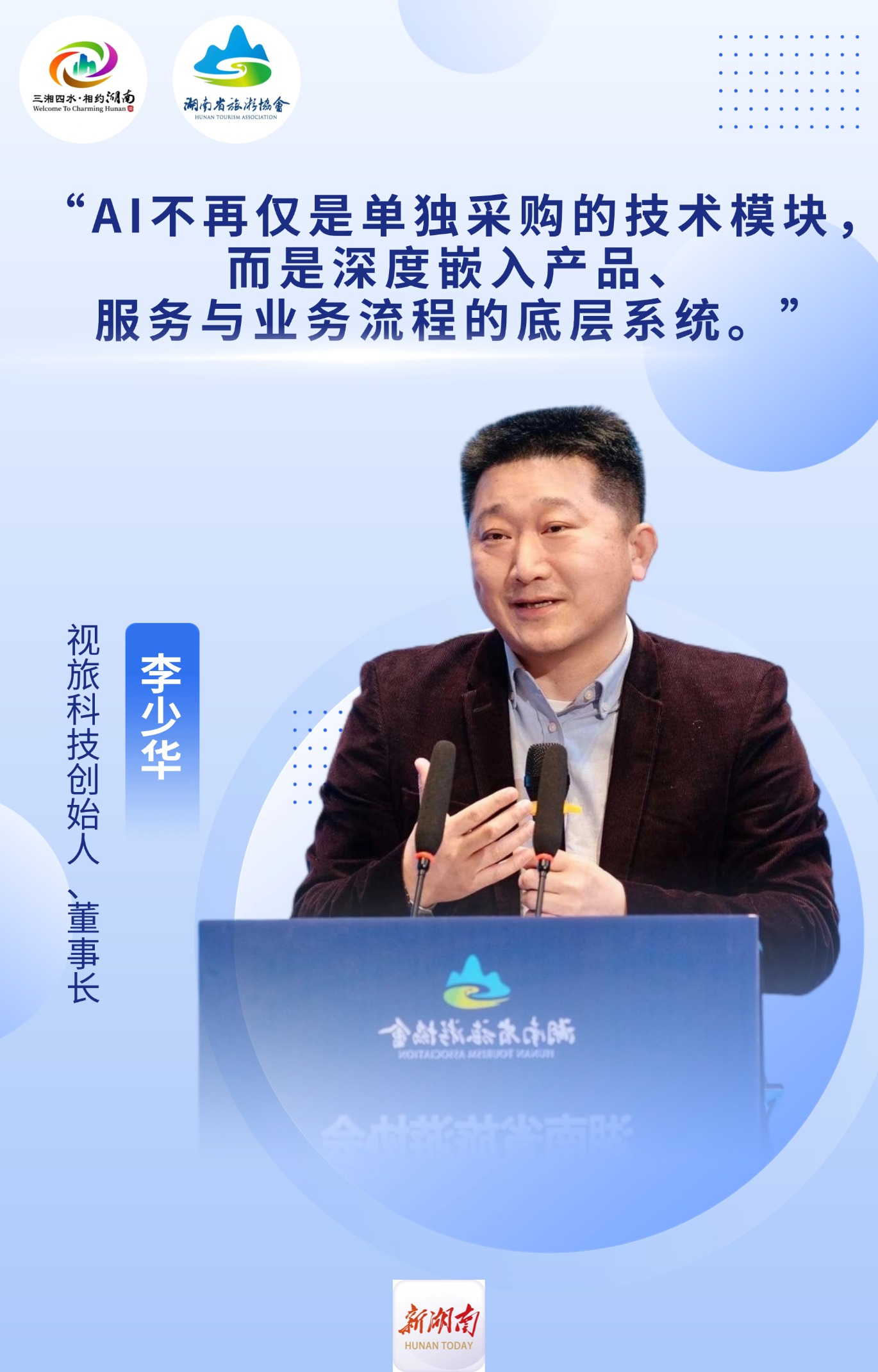 3月18日,在第五届湘江旅游论坛上,视旅科技创始人、董事长李少华以《从数据到智能:AI重构旅游产业的底层逻辑》为题进行分享,聚焦AI技术对旅游产业的深层重构。