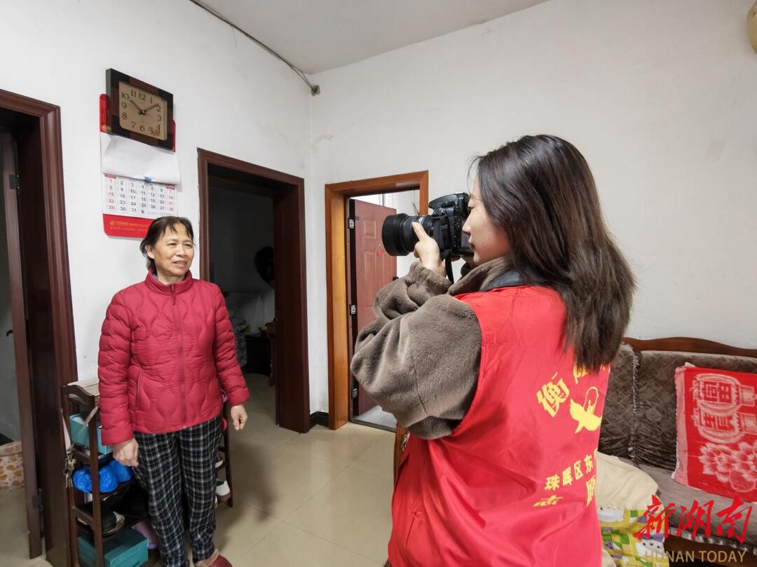 来自湖南工学院设计艺术学院的志愿者们现场为老人拍下照片。