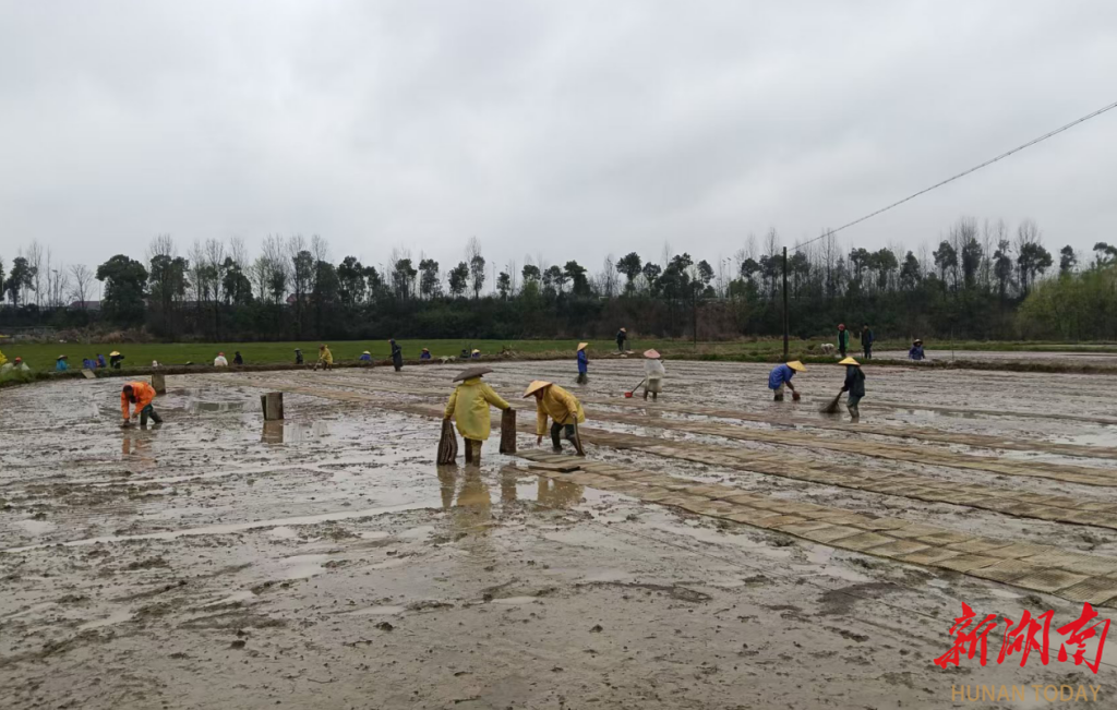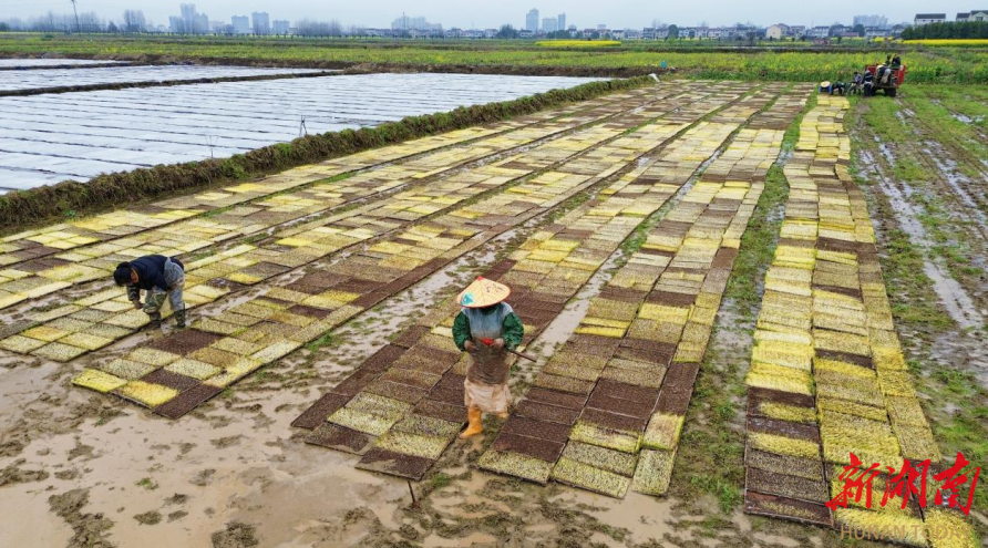 桃源县木塘垸镇,农户们正在摆秧盘。