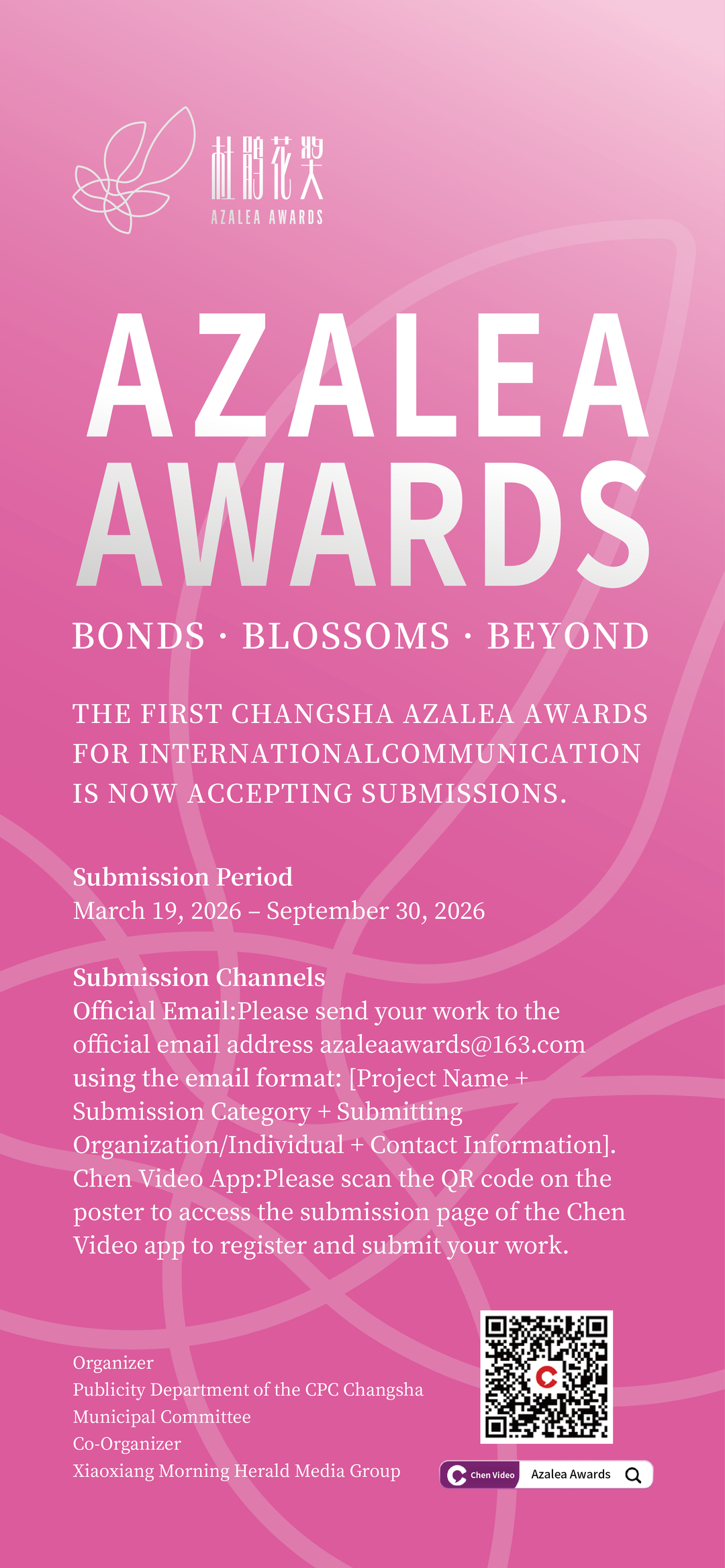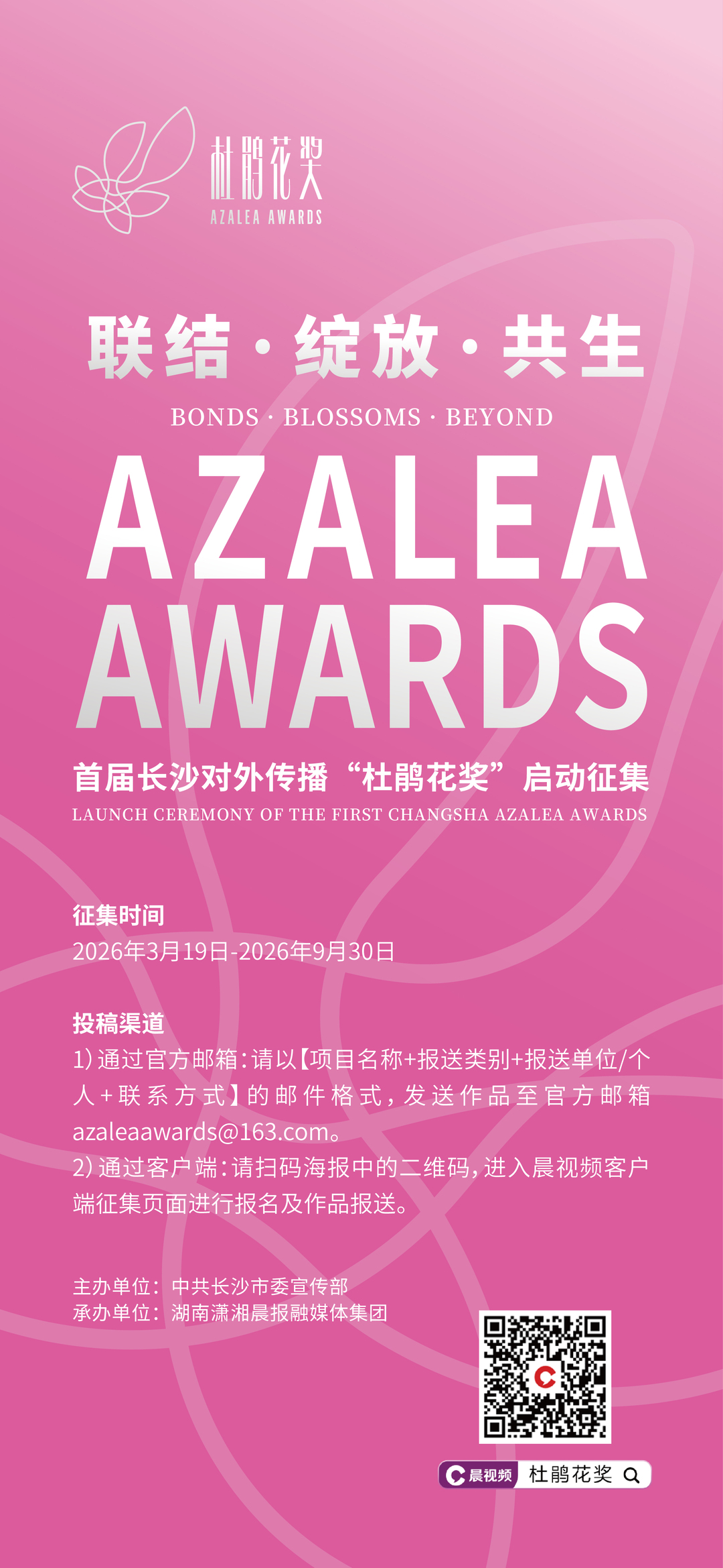 目前,首届长沙对外传播“杜鹃花奖”征集通道已正式开启,诚邀全球各界人士踊跃参与,用镜头捕捉长沙风采、用文字传递城市温度、用创意搭建沟通桥梁,让更多人听见长沙声音、看见长沙魅力,共同书写长沙与世界“美美与共”的传播篇章。