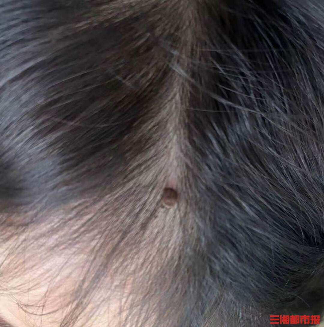 经皮肤科医生廖威检查,这颗“小黑痣”其实是一只蜱虫,正牢牢吸附在头皮上吸血,虫体已部分嵌入皮肤,触角还在轻微蠕动。