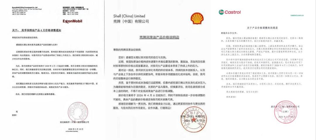 近期,中东局势的骤然升级,其涟漪正快速越过地理边界,传导至国内制造业的成本端,国内润滑油行业接连传出调价消息。美孚、壳牌、嘉实多、统一、长城等国内外润滑油品牌,先后宣布涨价,涨幅在5%-10%。