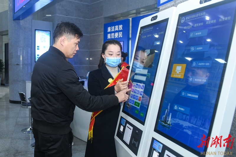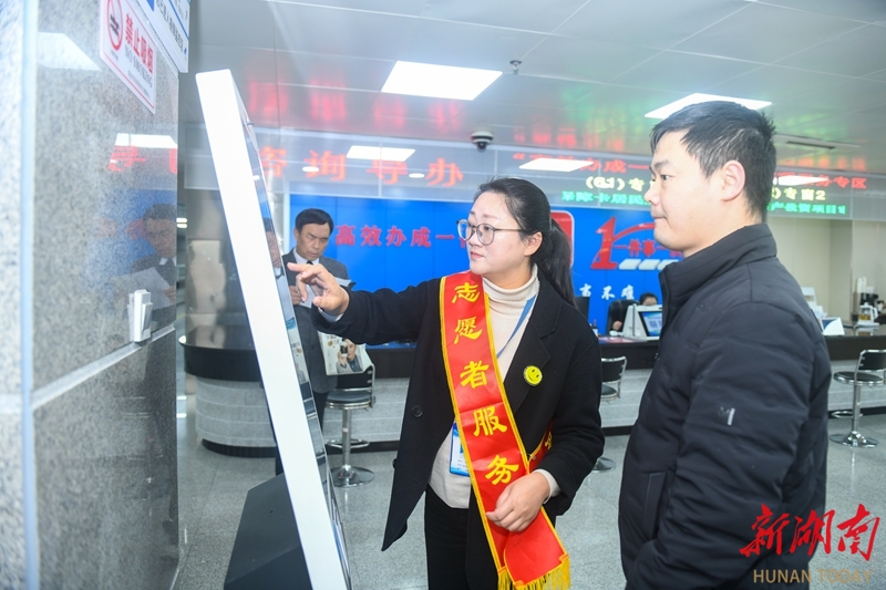 3月19日,娄底市政务服务中心,党员志愿者在指导市民使用政务服务智能终端办理业务。为持续优化营商环境,该中心聚焦“高效办成一件事”,设立“帮办代办服务台”,组建党员志愿者专班,为企业和群众提供咨询、网上申办、全流程跟踪等服务,让政务服务更暖心舒心。吴永华 摄(湖南图片库)